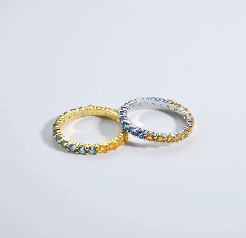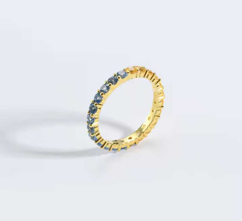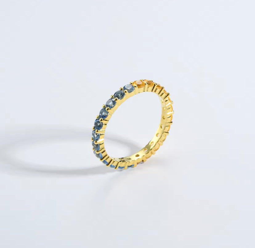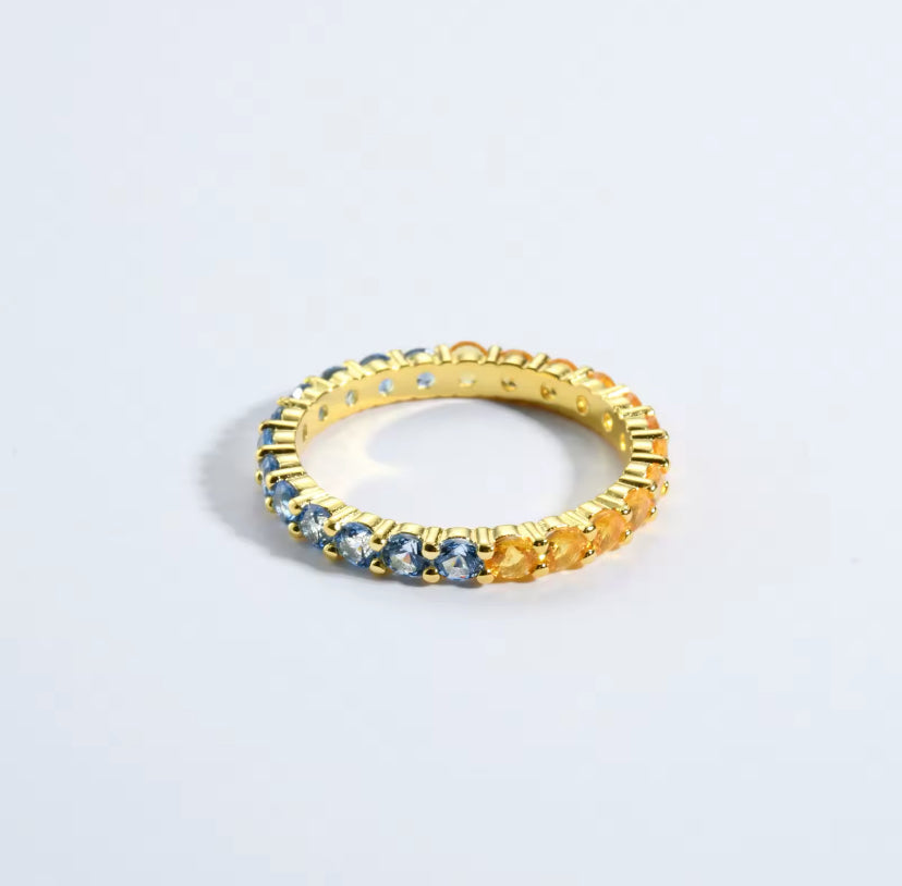 Anillo rodeado de circones en tonos ambar y azul en degradé, es un complemento ideal para agregar un toque de color cualquier combinación.