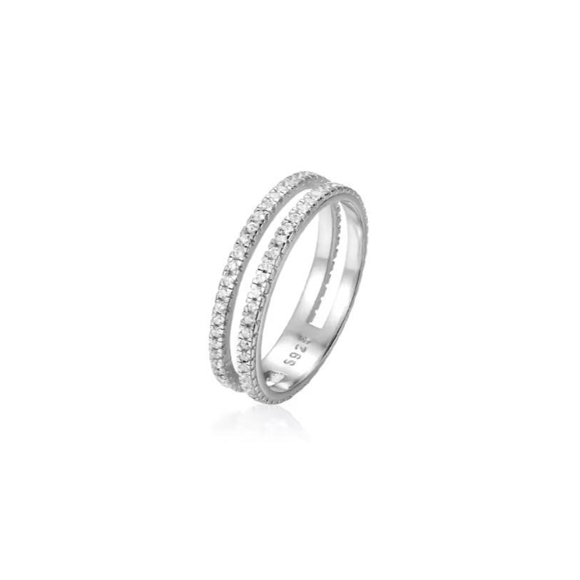 Delicado anillo doble rodeado de mini circones, clásico pero con un toque moderno, es ideal para hacer múltiples combinaciones y llevar un look de diario a otro Nivel.