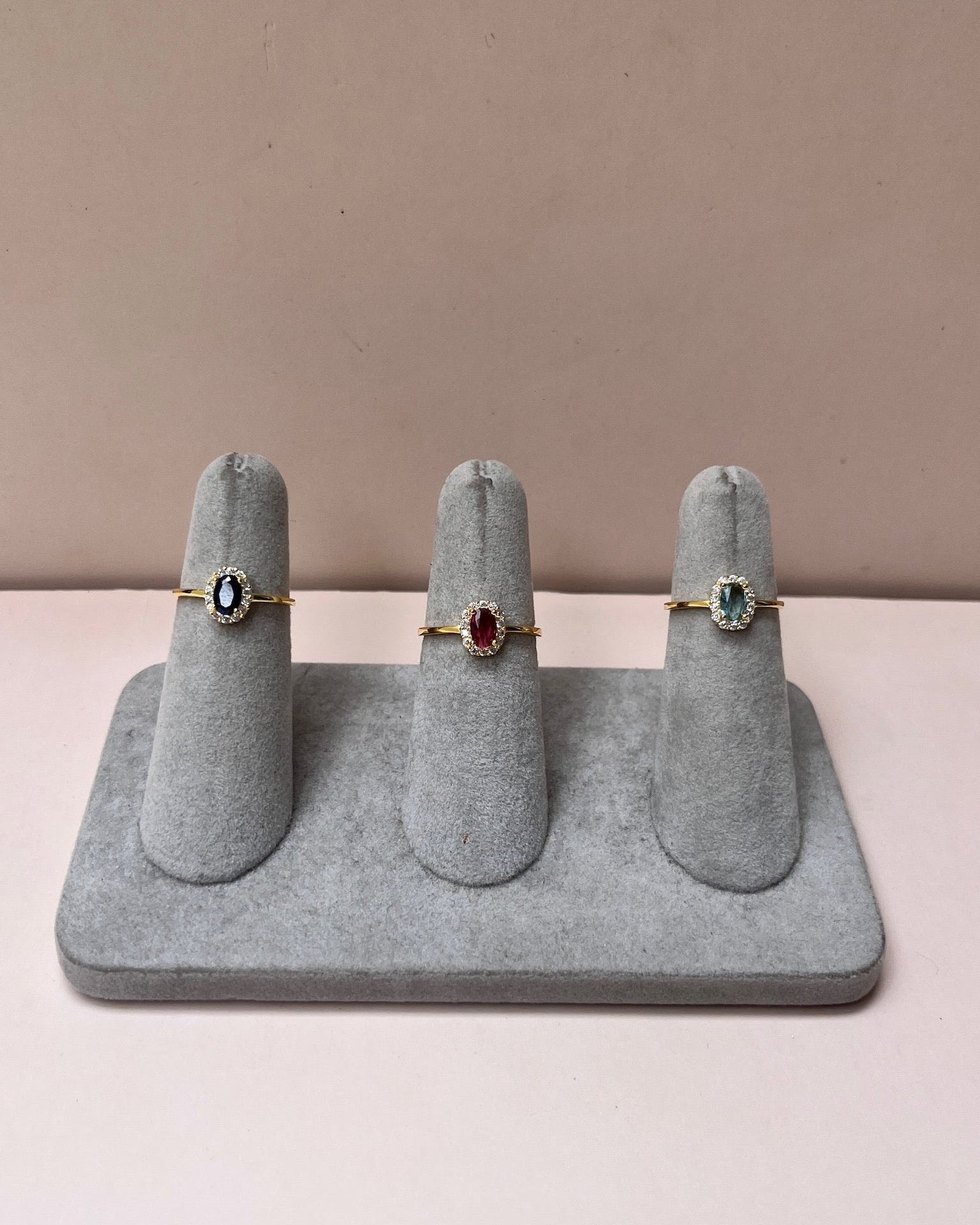 Elegante anillo con piedra central rodeadas de circones transparentes, sencillo y atemporal, es un complemento perfecto para agregar un toque de color a cualquier combinación.