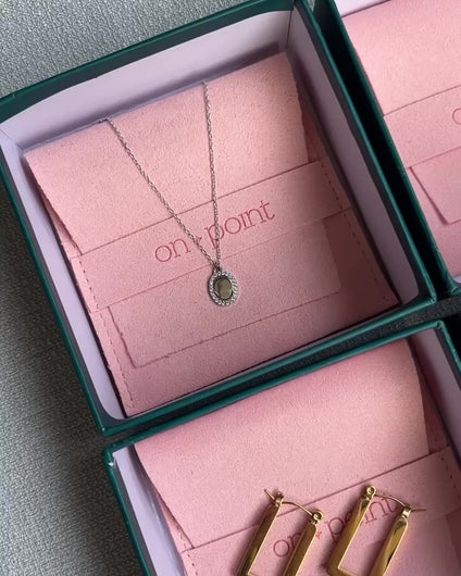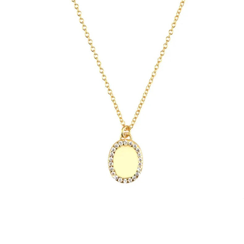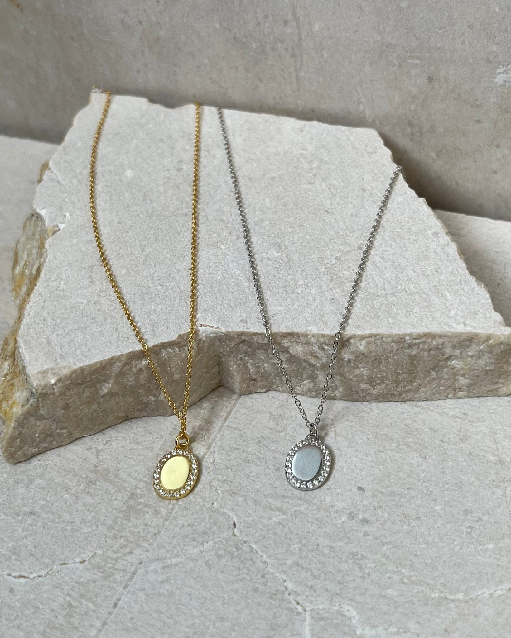 Delicado collar con dije central de placa rodeadas de un borde de circones brillantes, clásico y elegante, es el complemento perfecto para tu look de diario o para una ocasión especial.
