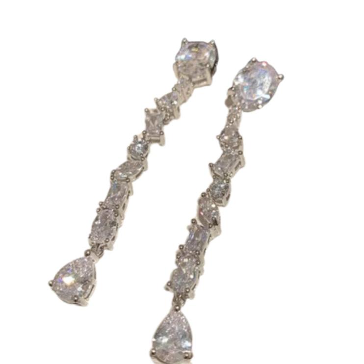 Zarcillos largos con circones colgantes en distintos tonos, elegantes y sutiles, son ideales para hacer de cualquier combinación un look de alto impacto.