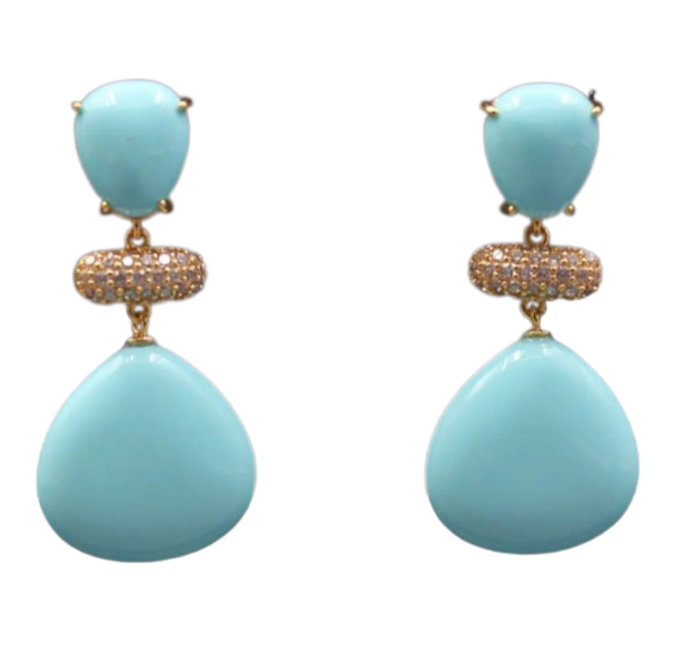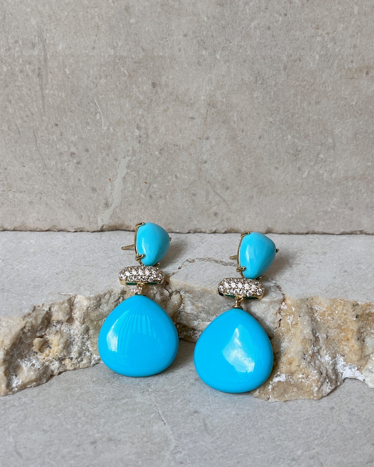 Zarcillos largos con cristales incrustados en tonos turquesa, elegantes y coloridos,