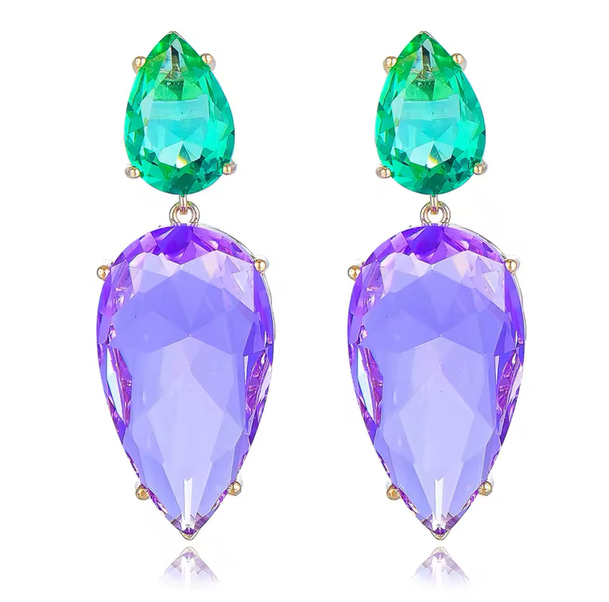 Zarcillos largos con circones en forma de gota en tonos verde y morado, divertidos y coloridos, son ideales para hacer de cualquier combinación un look de impacto.