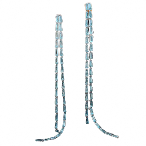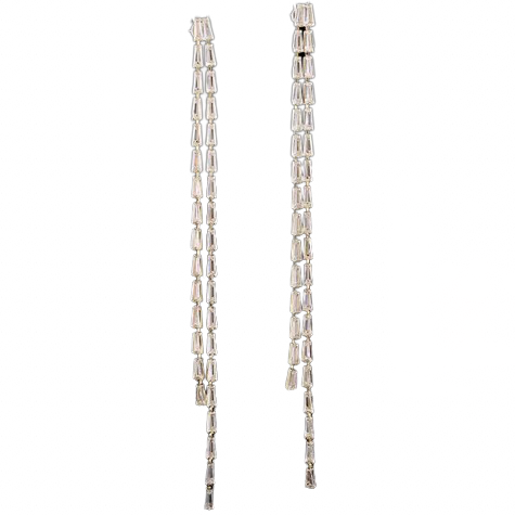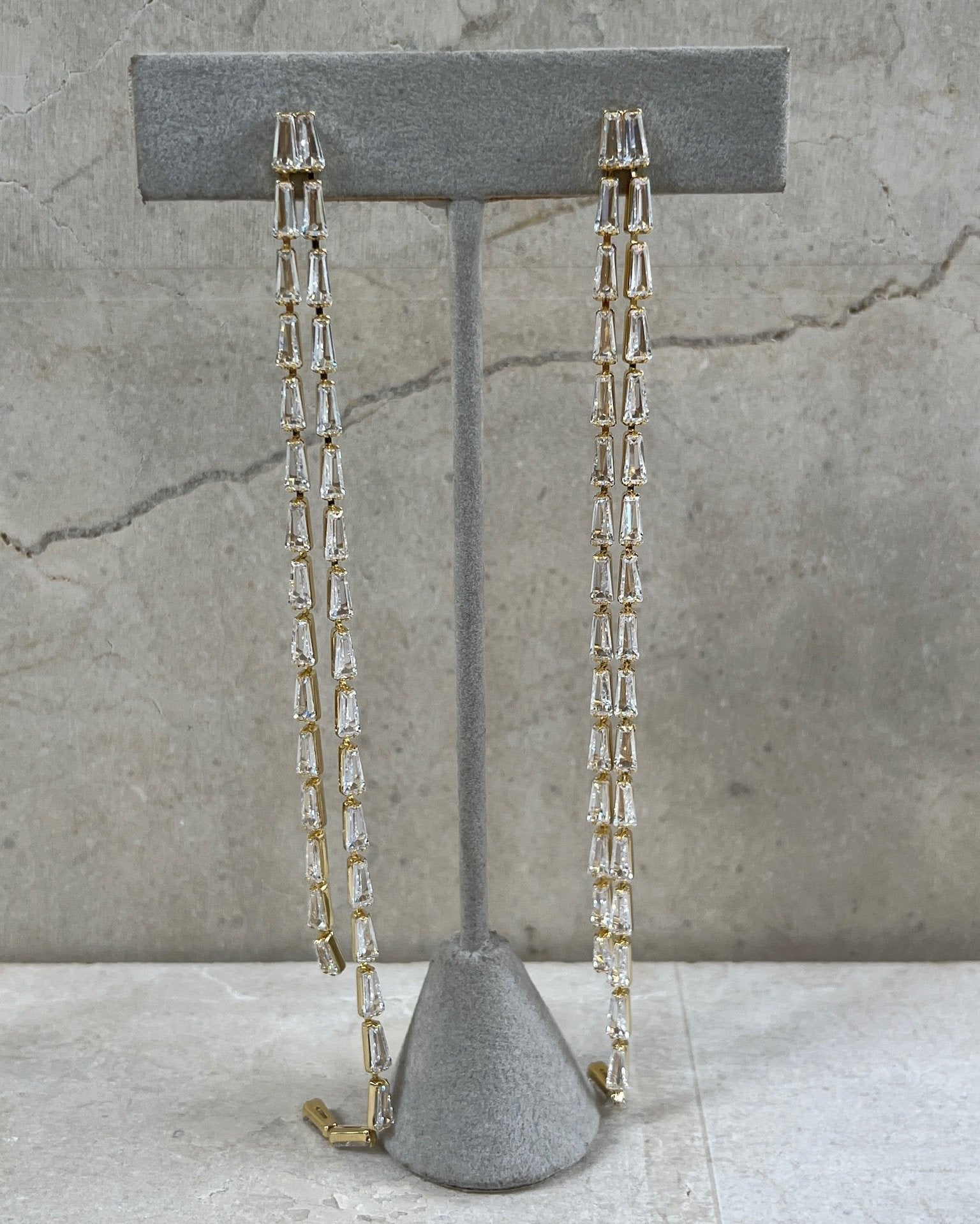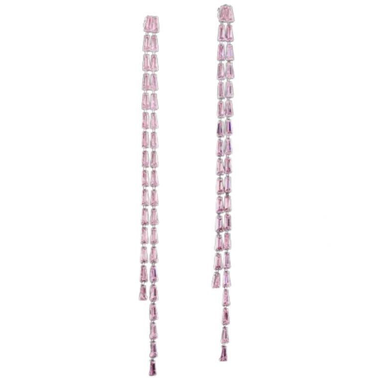 Zarcillos largos incrustados con circones en múltiples tonos, sutiles y elegantes, son ideales para hacer de cualquier combinación un look de impacto.