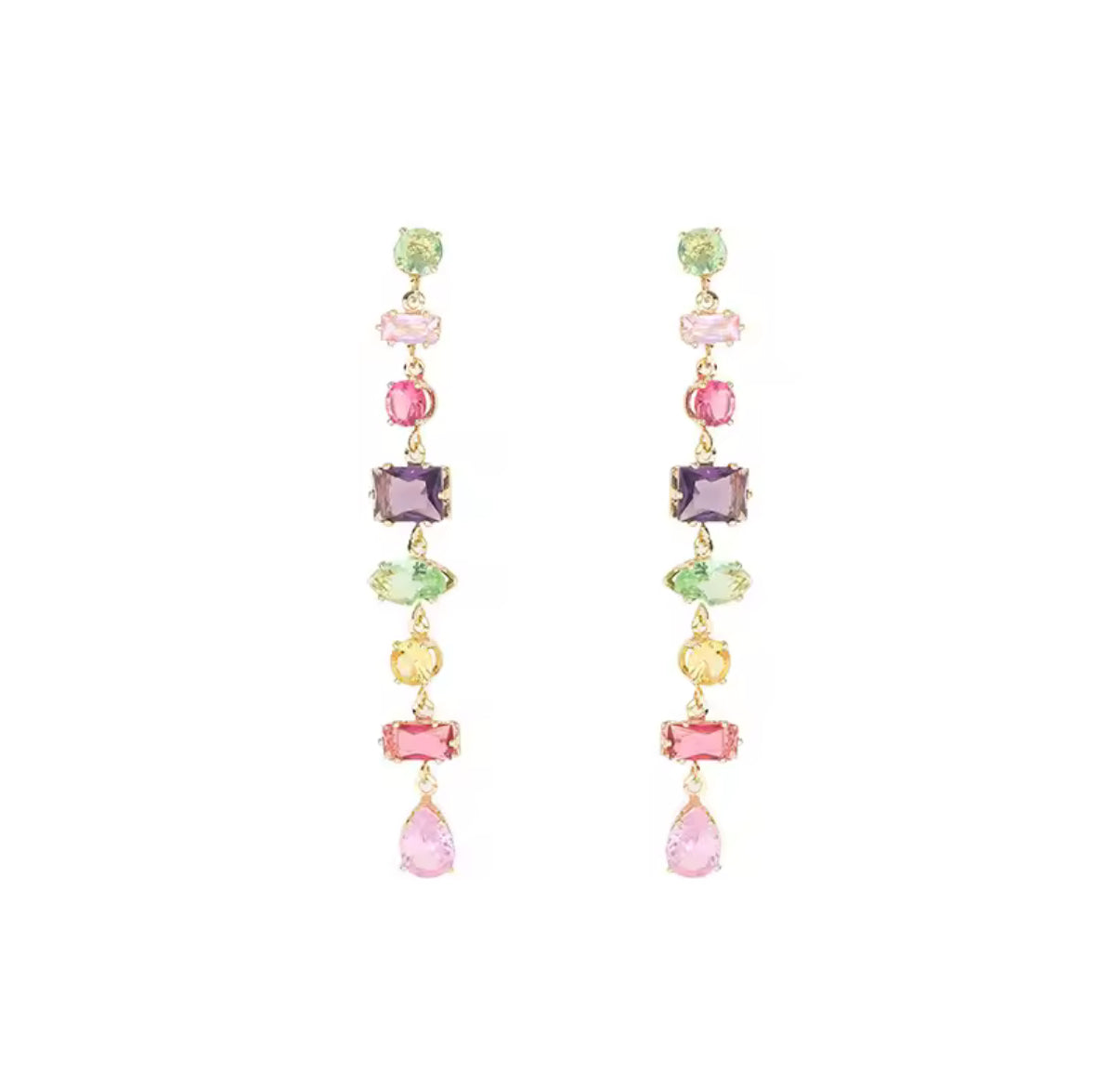Zarcillos largos de circones colgantes multicolores, divertidos y elegantes a a la vez. S