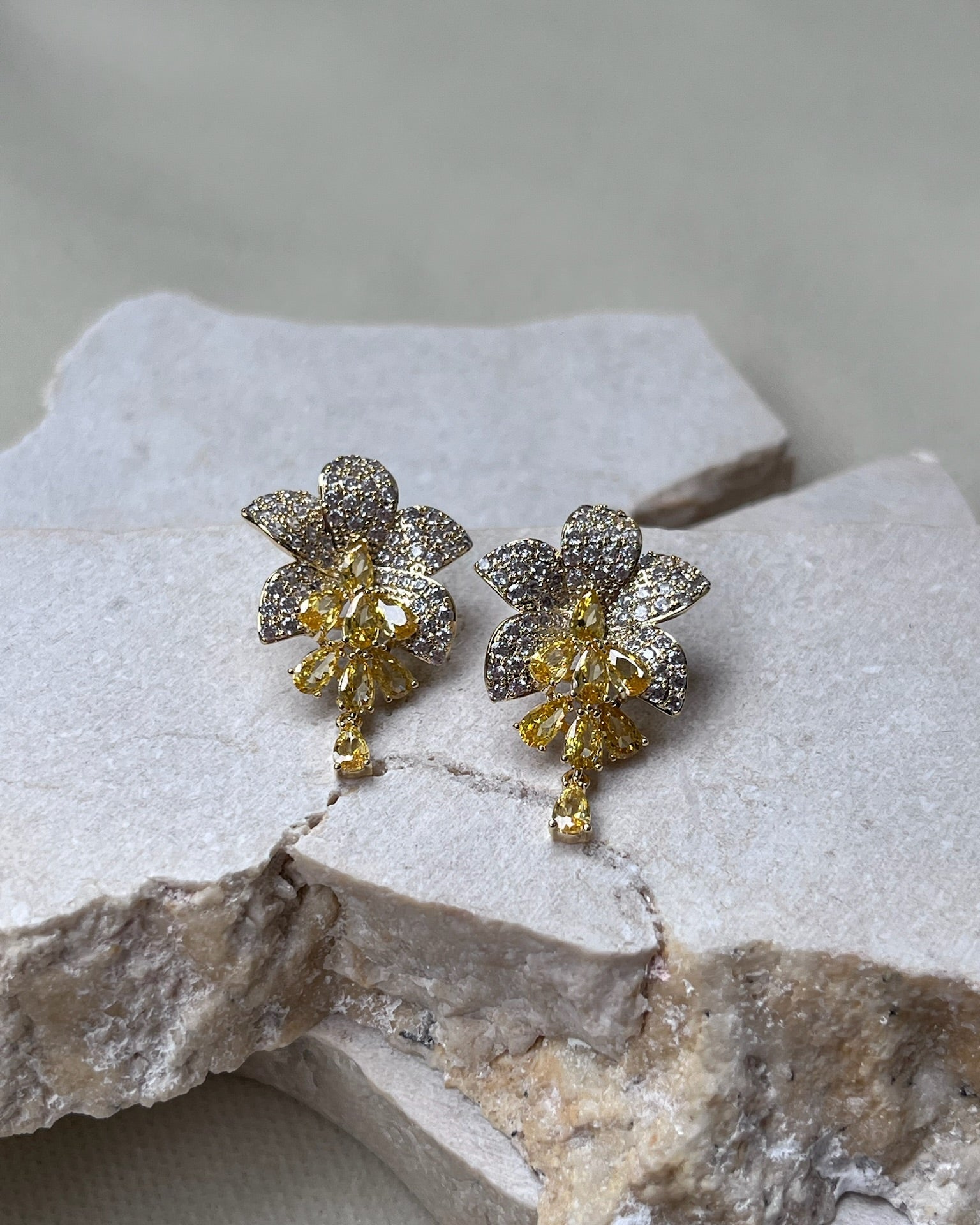 Zarcillos en forma de flor con pistilos colgantes, lleno de circones brillantes incrustados, son un complemento romántico y delicado que hará de cualquier combinación un look de impacto.