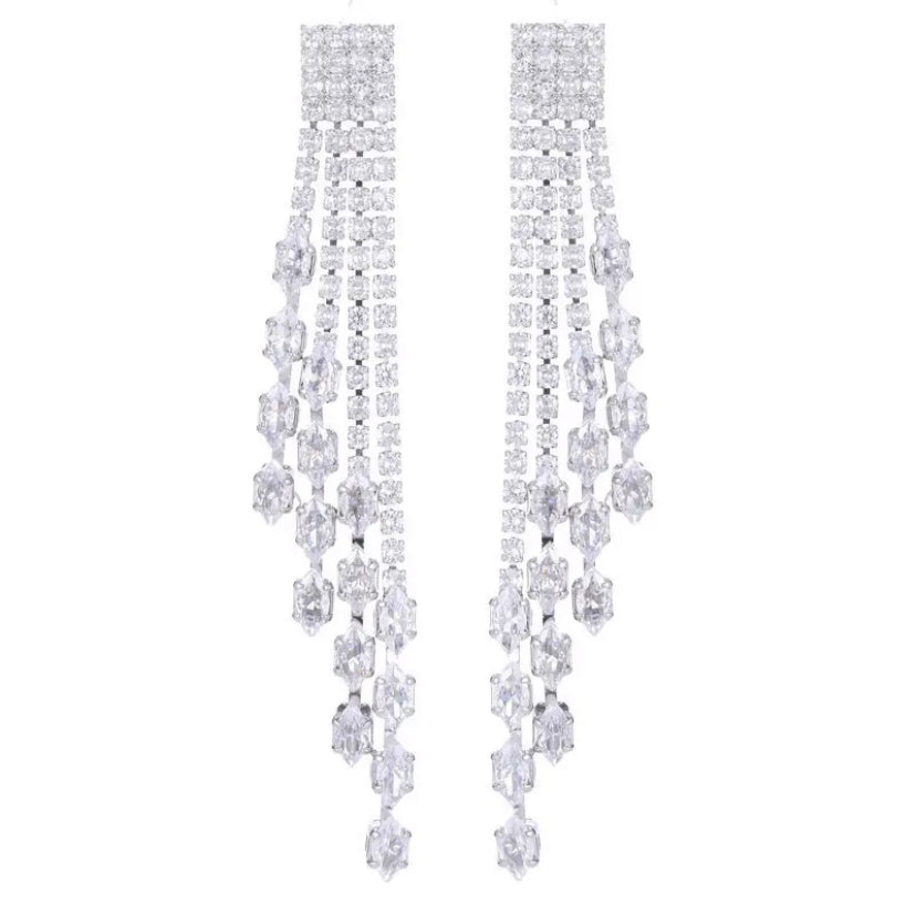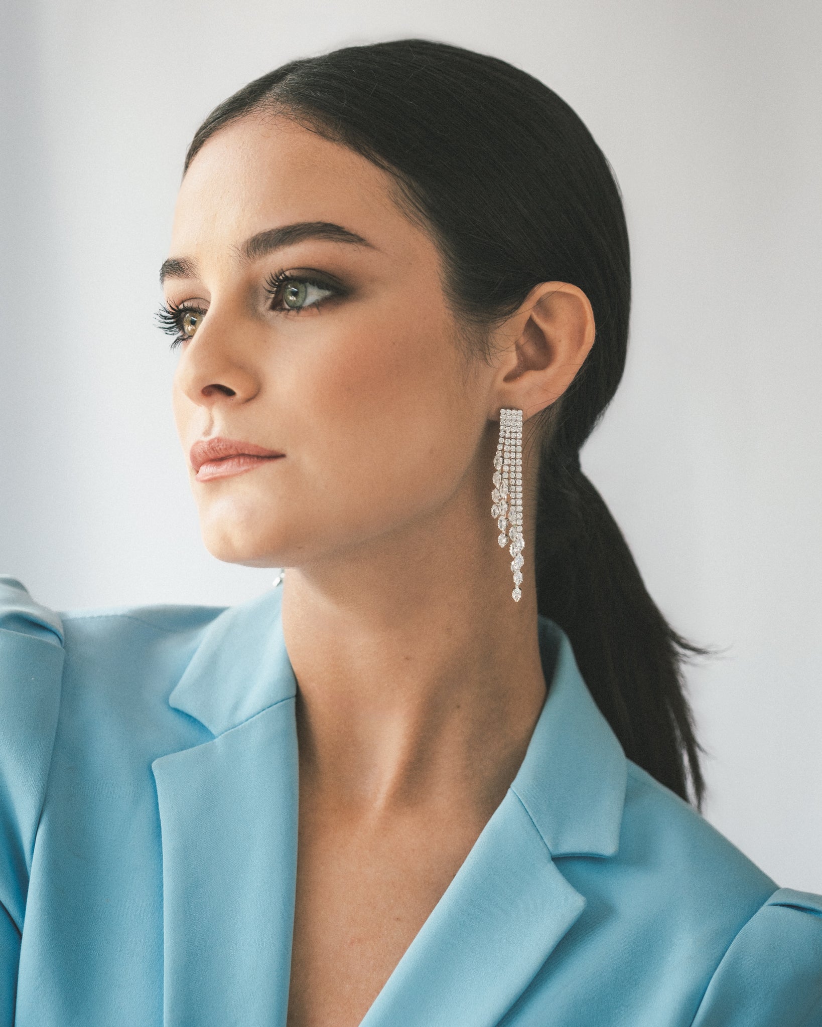 Zarcillos largos con hilos de circones brillantes en caída de cascada, elegantes y sofisticados, son el complemento perfecto para hacer de cualquier combinación un look de impacto.