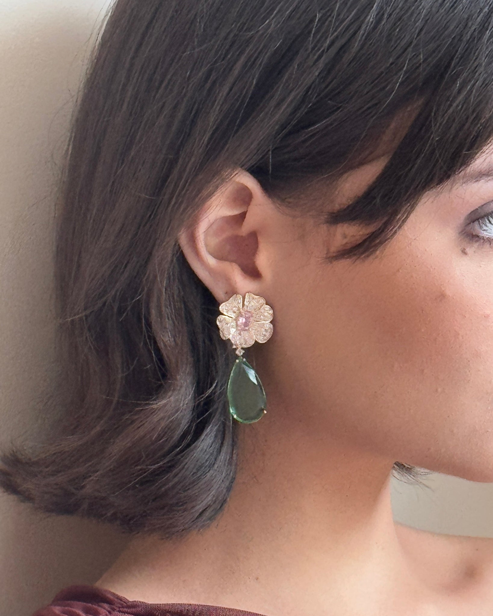 Zarcillos de noche en forma de flor con detalles de gotas colgantes, elegantes y llamativos, son ideales para hacer de cualquier combinación un look de impacto.