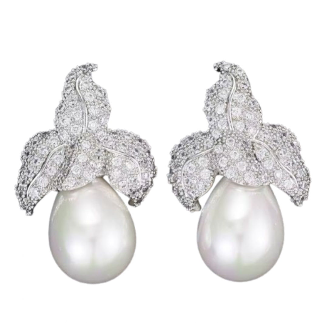 Zarcillos cortos en forma de flor con perlas colgantes, elegantes y eclécticos,