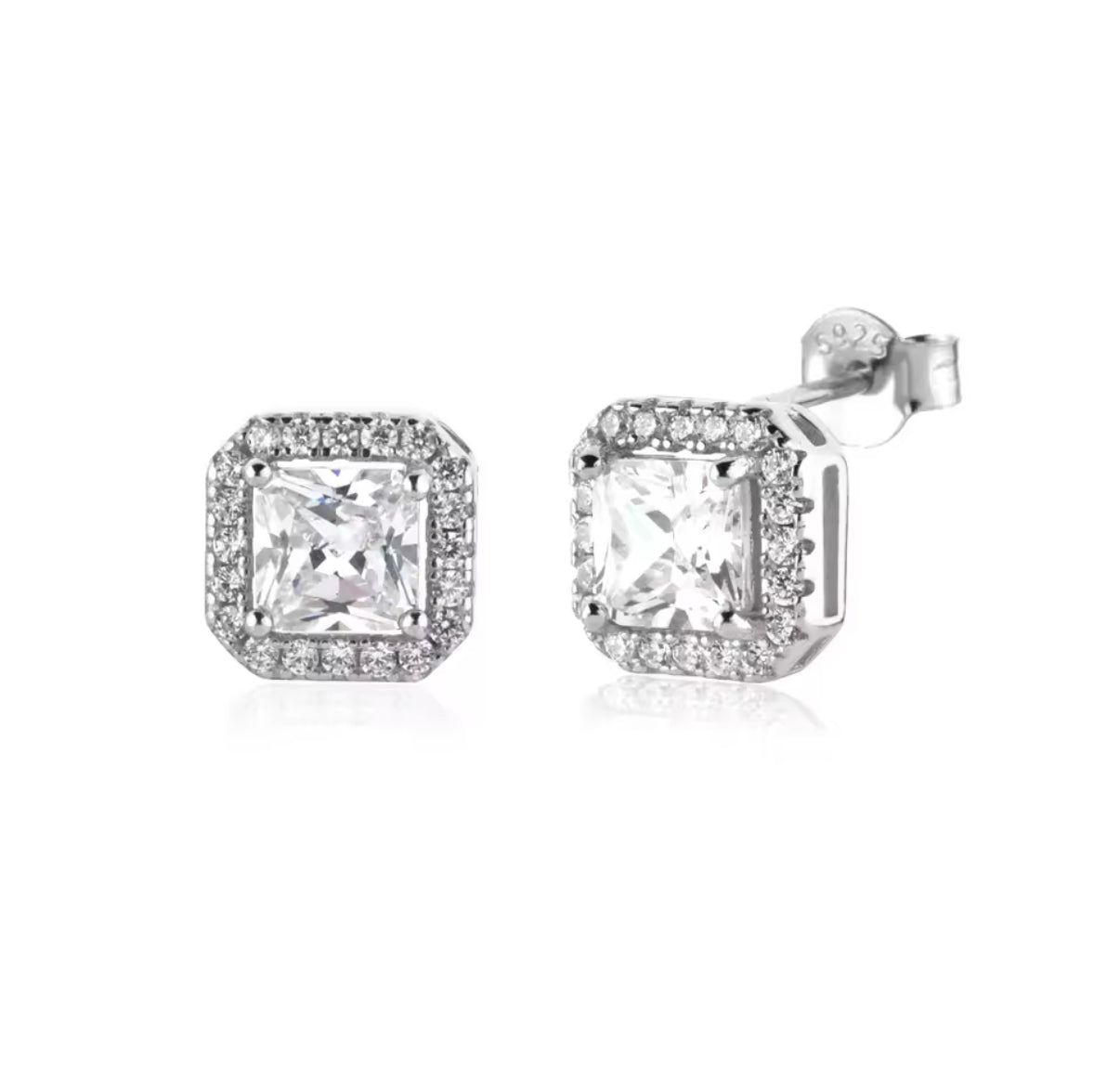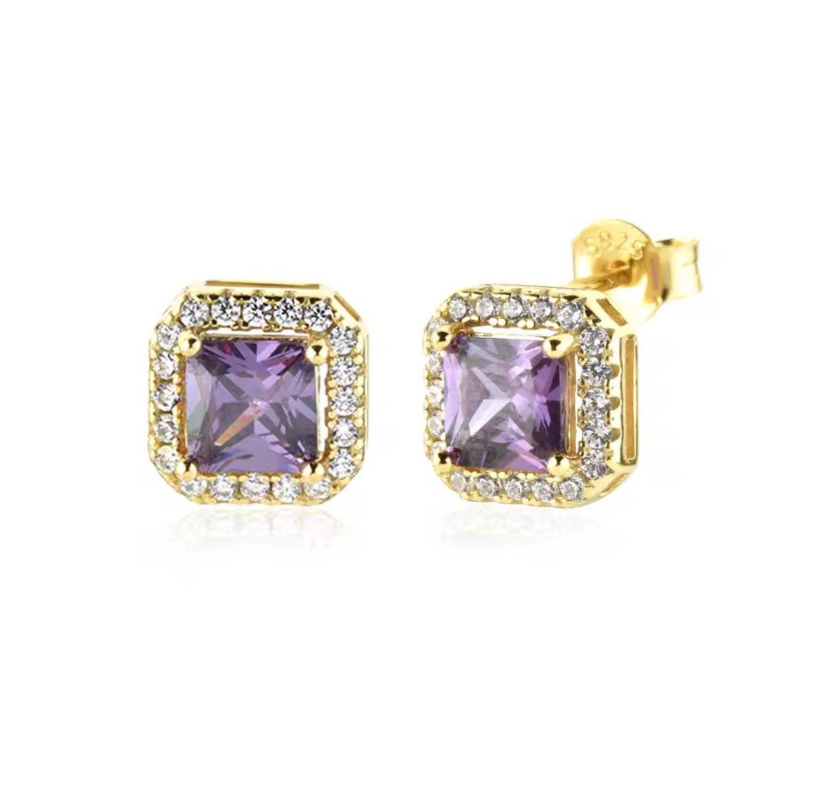 Zarcillos cuadrados con circón central y pequeñas piedras a su alrededor, pequeños y clásicas son perfectos para el uso diario. Disponible en diferentes colores.