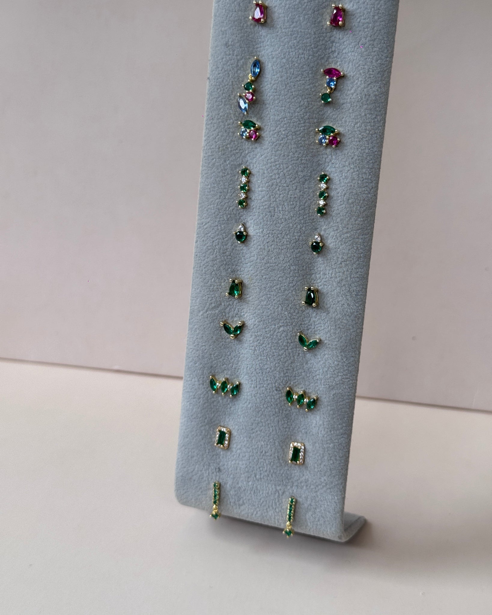 Zarcillos Rectangulares con un circón central en tono verde esmeralda y piedras brillantes a a su alrededor, son un complemento perfecto para agregar un toque de luz y de color a cualquier look de diario.