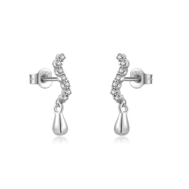 Zarcillos en forma curvada, con detalles de circones brillantes y una gota colgante, ideales para el día a día o para combinar con mas zarcillos, su tamaño los hace ideales para piercings o segundas perforaciones.