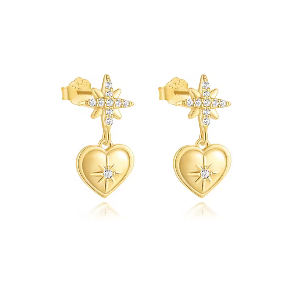 Zarcillos en forma de estrellas con corazón colgante y circones brillantes a su alrededor, elegantes y divertidos son ideales para el uso diario o para una ocasión especial.