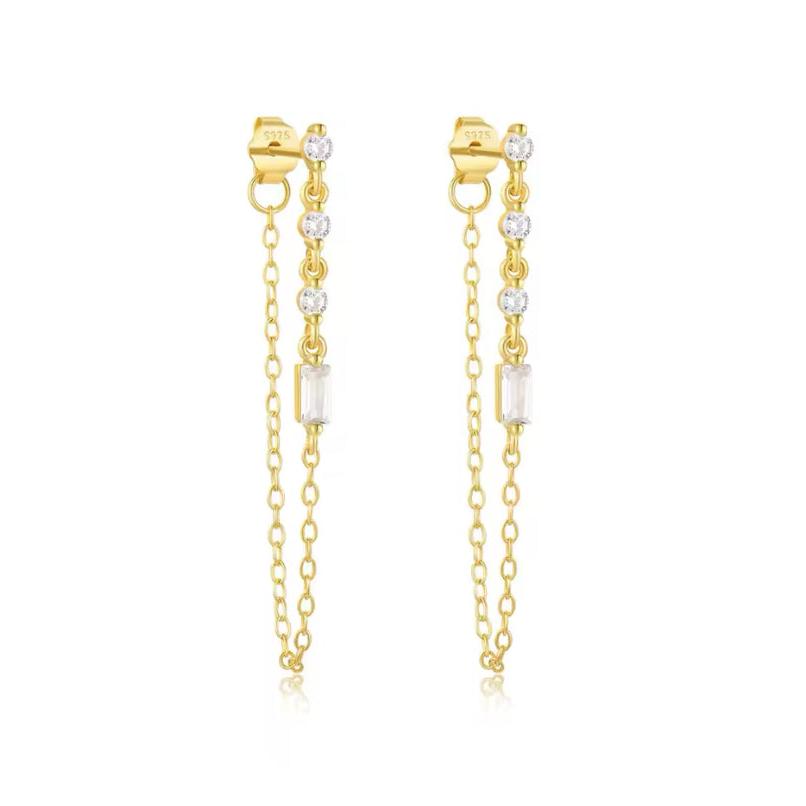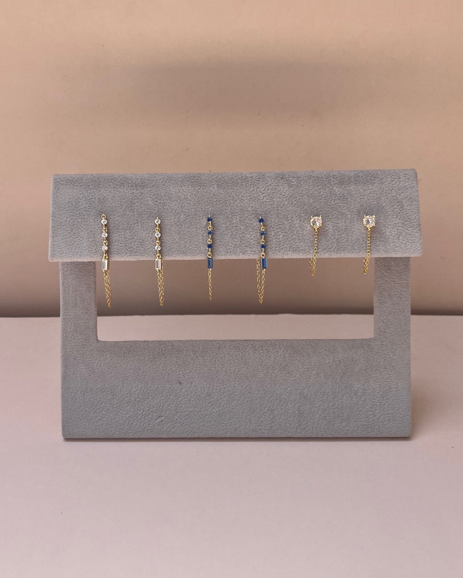 Zarcillos con detalles de circones colgantes en tono azul unidos al broche con una cadena, atemporal y elegantes, son el complemento perfecto para darle un toque de color a una ocasión especial.