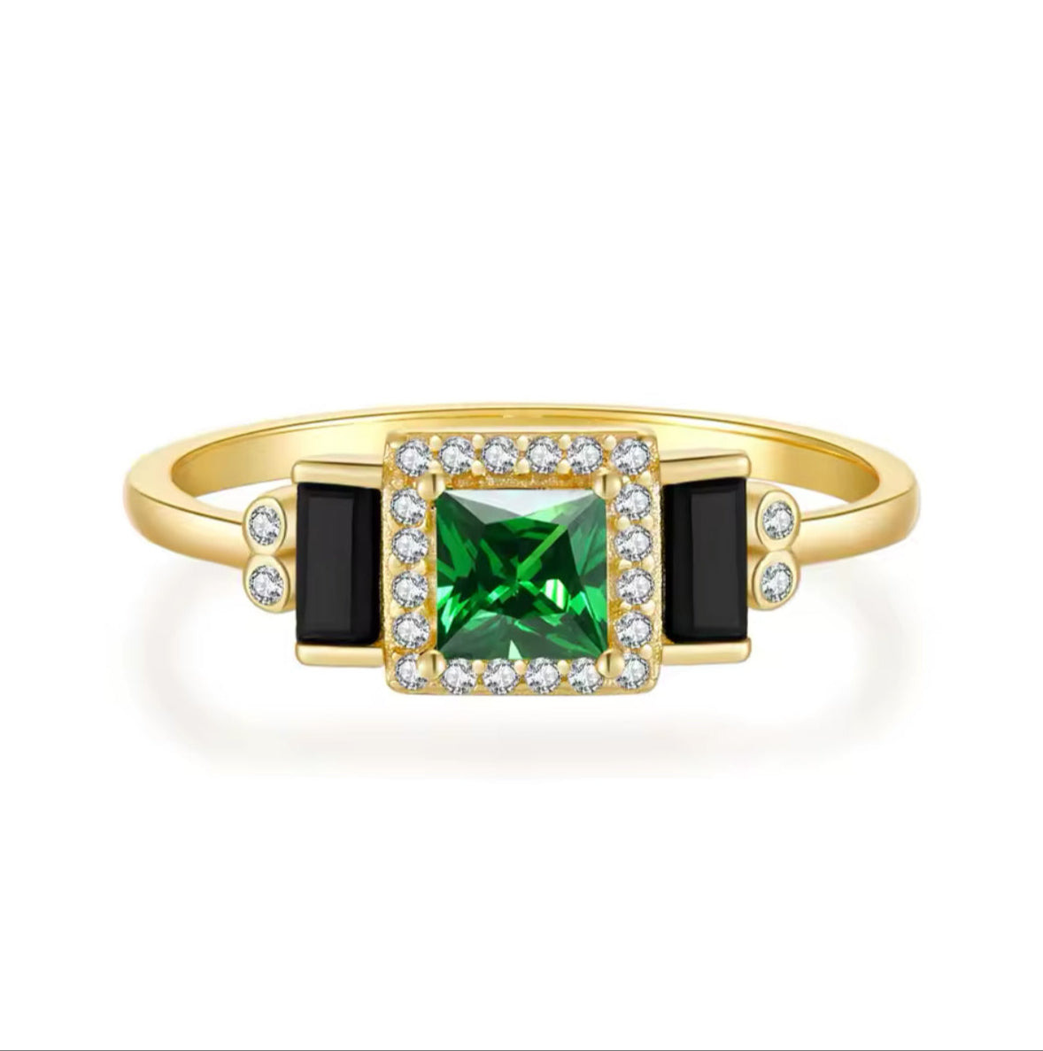 Elegante anillo con detalle central en circones en tonos verde esmeralda y negro, ideal para agregar carácter y color a cualquier combinación.